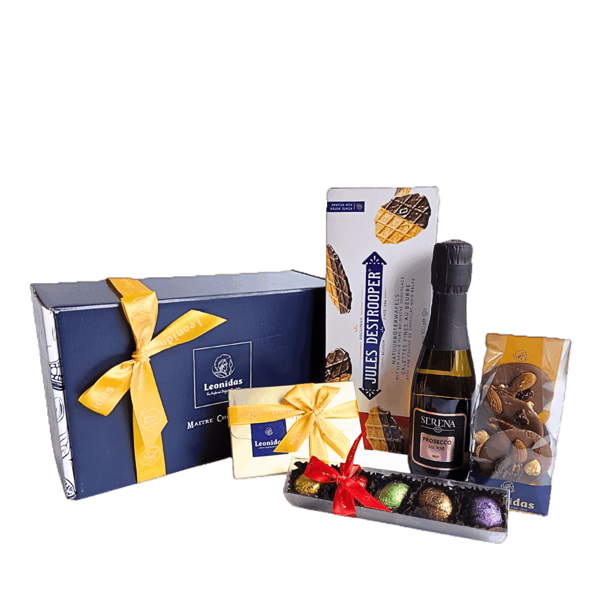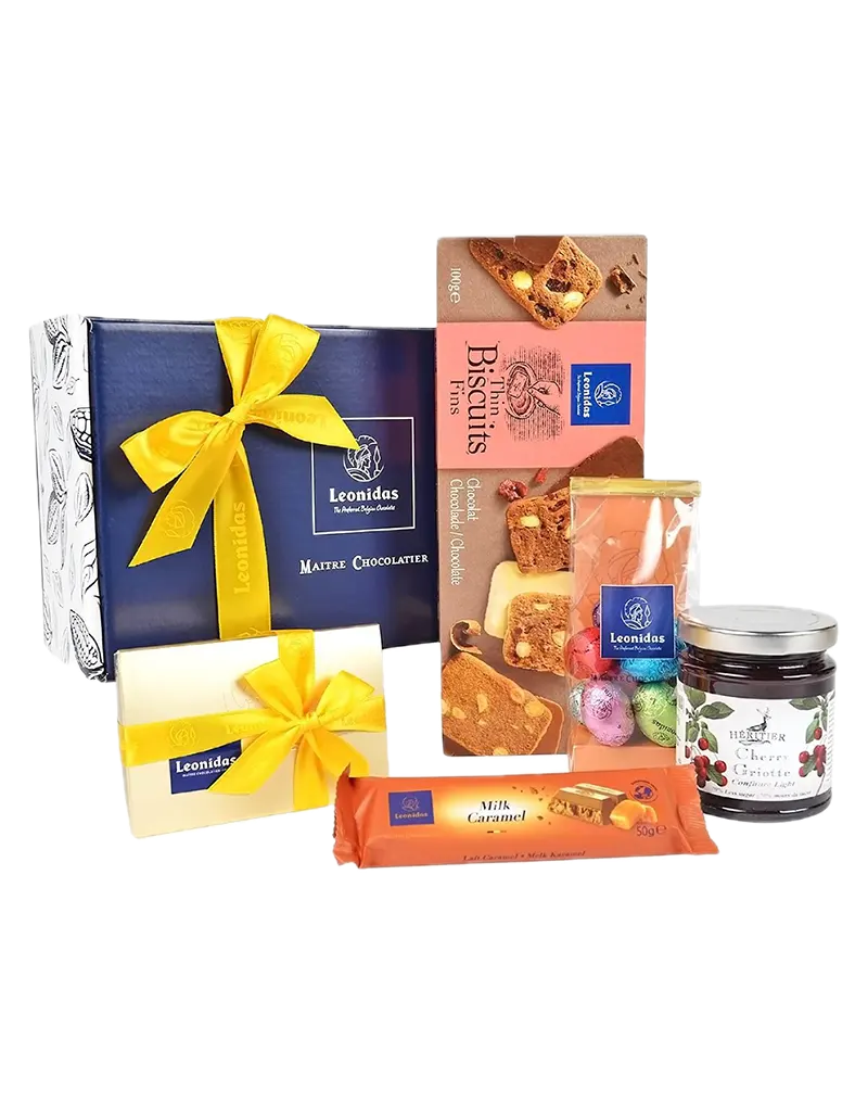 Împărtășește bucuria Paștelui cu acest cadou delicios: un ballotin cu 8 praline din ciocolata belgiana, o specialitate mendiant de 65g, o cutie de biscuiti belgieni Jules Destrooper de 100g, un prosecco de 200ml Terra Serena, o rigleta cu 6 minioua din ciocolata belgiana cu lapte, alba sau neagra și o cutie cadou Leonidas! Comandă acum și bucură-te de livrare rapidă oriunde în România, calitate garantată!