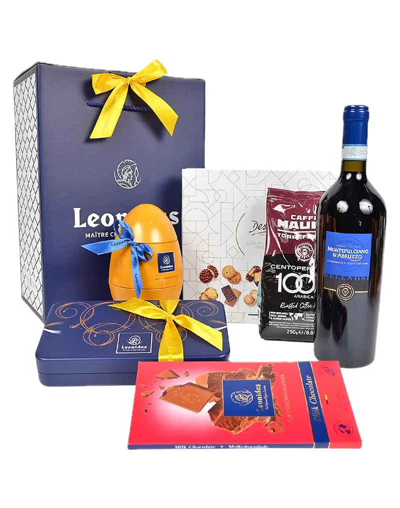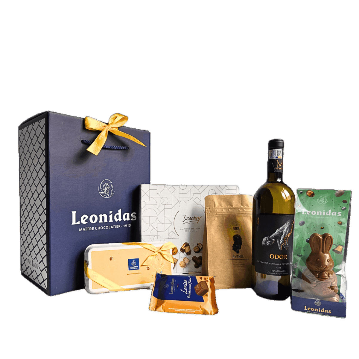 Împărtășește bucuria Paștelui cu acest cadou delicios: cofrag cu 12 miniouă din ciocolata belgiana Leonidas, o figurină de Paște din ciocolată Leonidas de 50g, o tabletă din ciocolată belgiana Leonidas de 75g, o cafea de origine proaspat prajita 100% arabica – 250g, o cutie de biscuiti Luxury Biscuits Selection Desobry, Belgia – 200g, o sticla de vin alb sec Odor Feteasca alba®ala, Dealu Mare, Crama DeMatei 0.75l si o cutie cadou Leonidas! Comandă acum și bucură-te de livrare rapidă oriunde în România, calitate garantată!