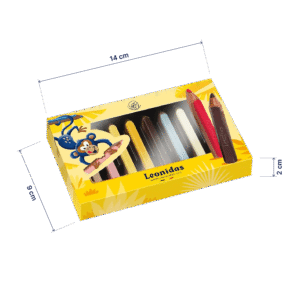 Creioanele de ciocolata Leonidas nu sunt doar delicioase, ci si atent gandite pentru a fi practice si atractive. Fiecare creion cantareste 9g, avand dimensiuni perfecte pentru mainile micutului tau – 8 cm lungime, 1 cm latime si 1.3 cm grosime.