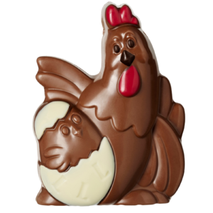 Figurina din ciocolata cu lapte, in patru culori, in forma de gaina impreuna cu un puisor.