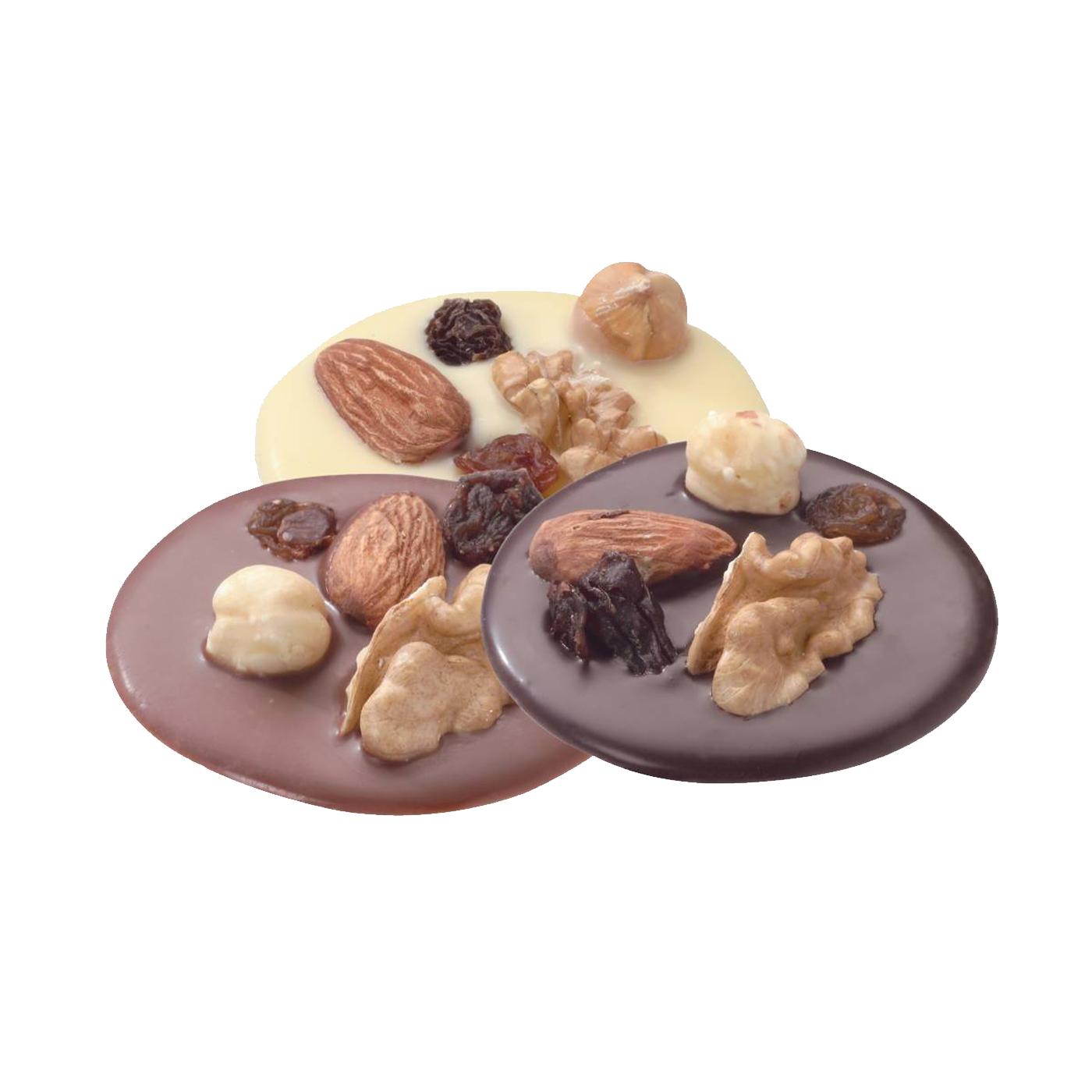 Mendiants sunt discuri rotunde din ciocolata alba, cu lapte sau neagra, pe care se presara stafide, nuci pecan, alune de padure si migdale. Fiecare bucata este atent realizata pentru a oferi un echilibru perfect intre dulceata ciocolatei si aroma lemnoasa si crocanta a nucilor.