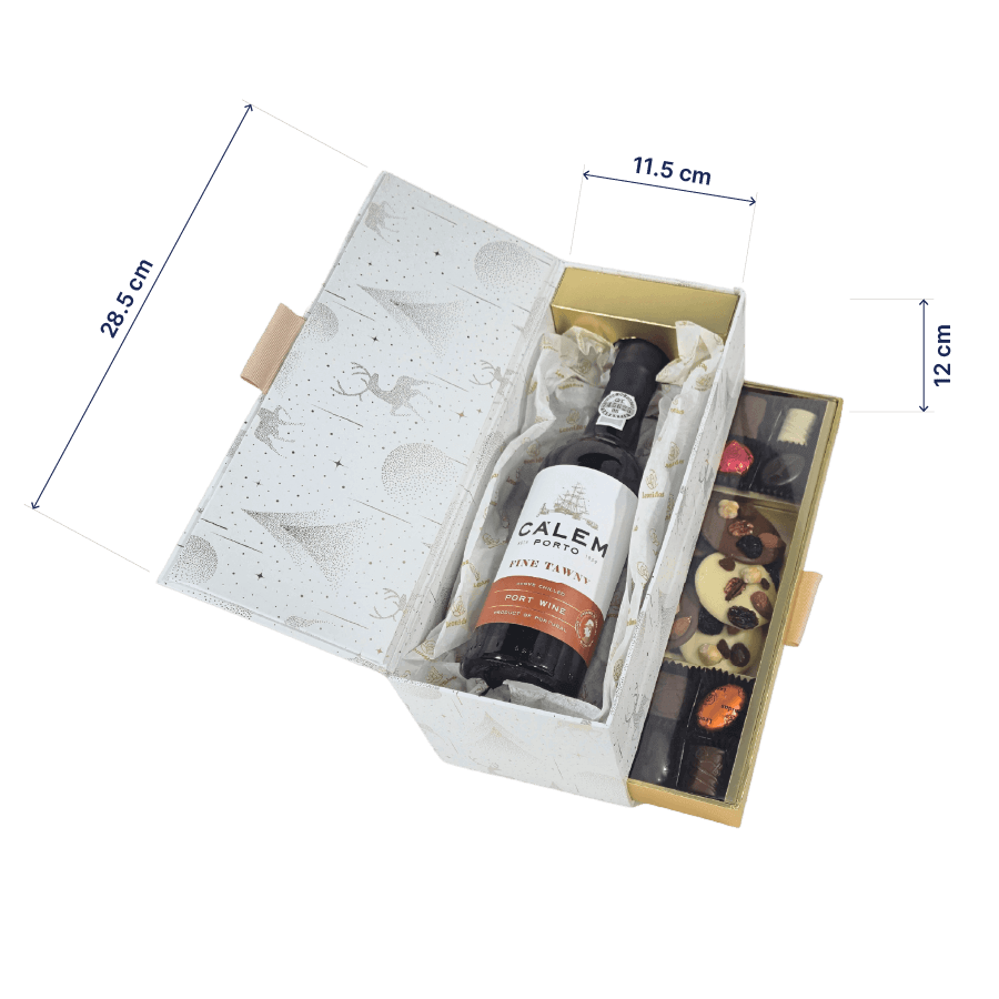 Pralines & Wine S este un cadou rafinat, conceput pentru a celebra eleganța momentelor speciale. Combinația distinsă dintre aproximativ 275 g de praline belgiene Leonidas și o sticlă de Porto Cálem Fine Tawny (0,375 L) oferă o experiență de degustare armonioasă, ce unește finețea ciocolatei cu profunzimea vinului.
